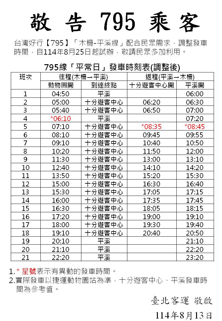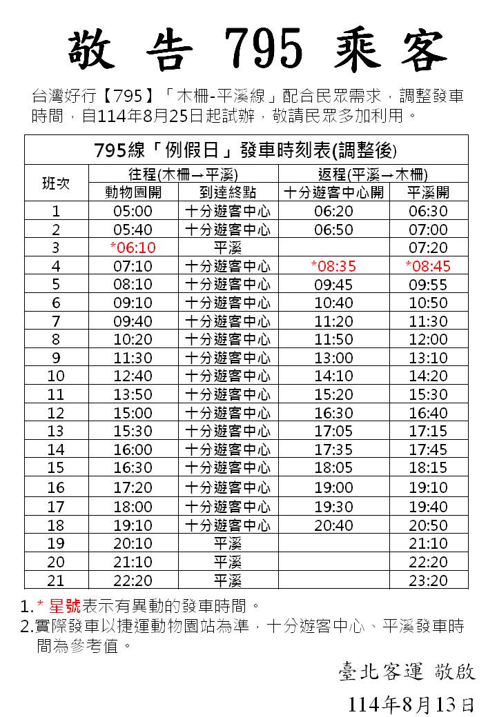 8/25起,【795】線調整發車時刻表